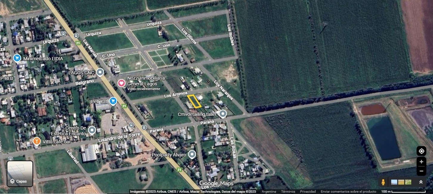 Descripción: Terreno ubicado sobre calle Los Aromos, entre calles los ceibos y los naranjos, a 20,45 metros de la primera hacia el Este. Aproximadamente a 120 metros de Ruta 21; mide 20,45 metros de frente al Norte , 21,80 metros en su contra frente al Sur , 44,33 metros el linea incliunada en su lado Este y 43,44 metros en linea inclinada en su lado Oeste; encierra una superfiece total de 805,25 metros cuadrados. Ubicado en barrio la rosetta, contando con todos los servicios de infraestructura , con escritura inmediata listo para transferir.
